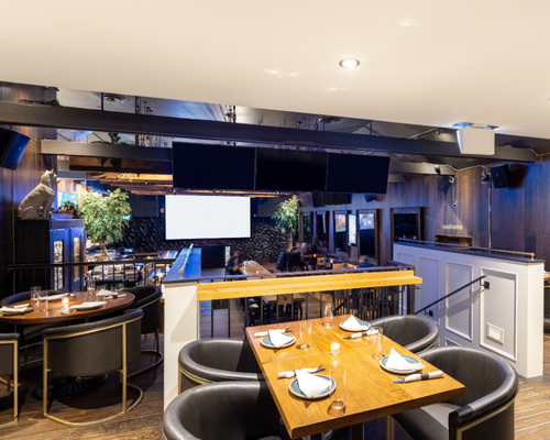Main floor with dance floor, dining, bar and a 16‑ft projection screen